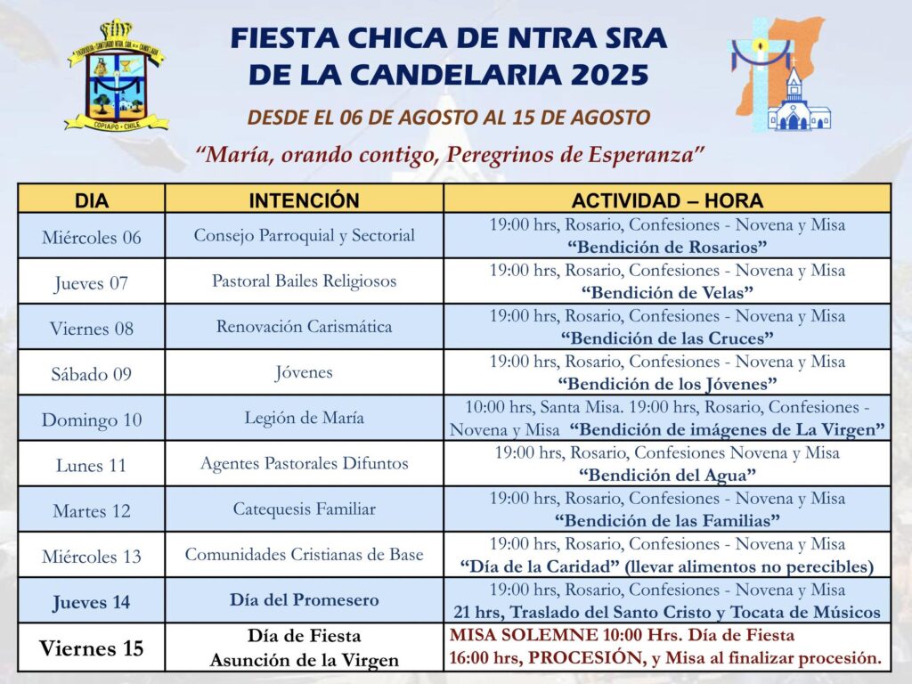 La Fiesta de la Virgen de La Candelaria en Copiapó, 2025, se celebrará con la programación de la Fiesta Chica , que incluye actividades religiosas y culturales del 06 al 15 de Agosto , misa y novena a las 19 horas con el lema “María, orando contigo. Peregrinos de Esperanza” según publicaciones del Santuario de La Candelaria de Copiapó.